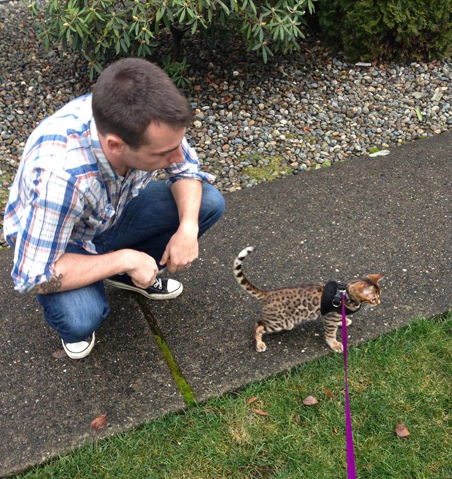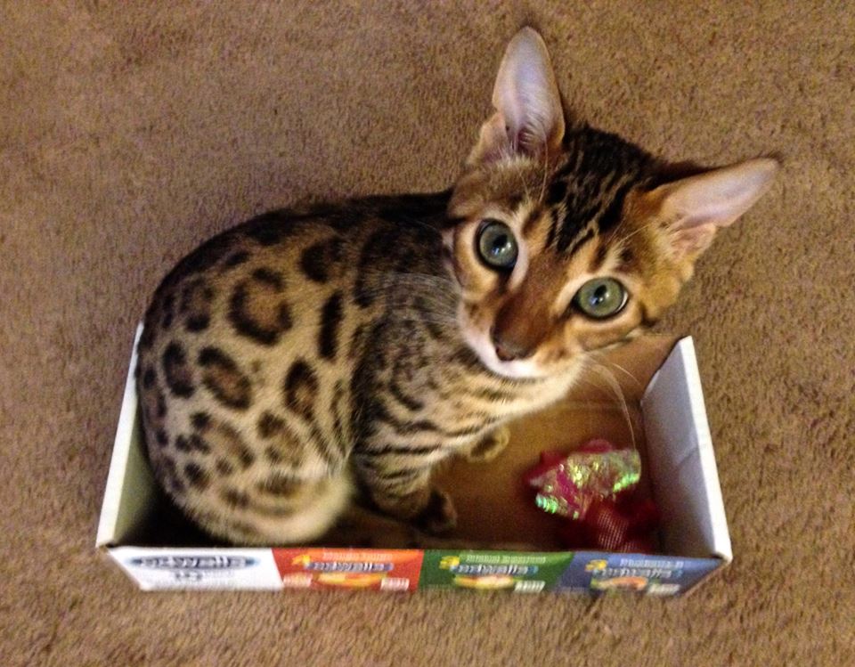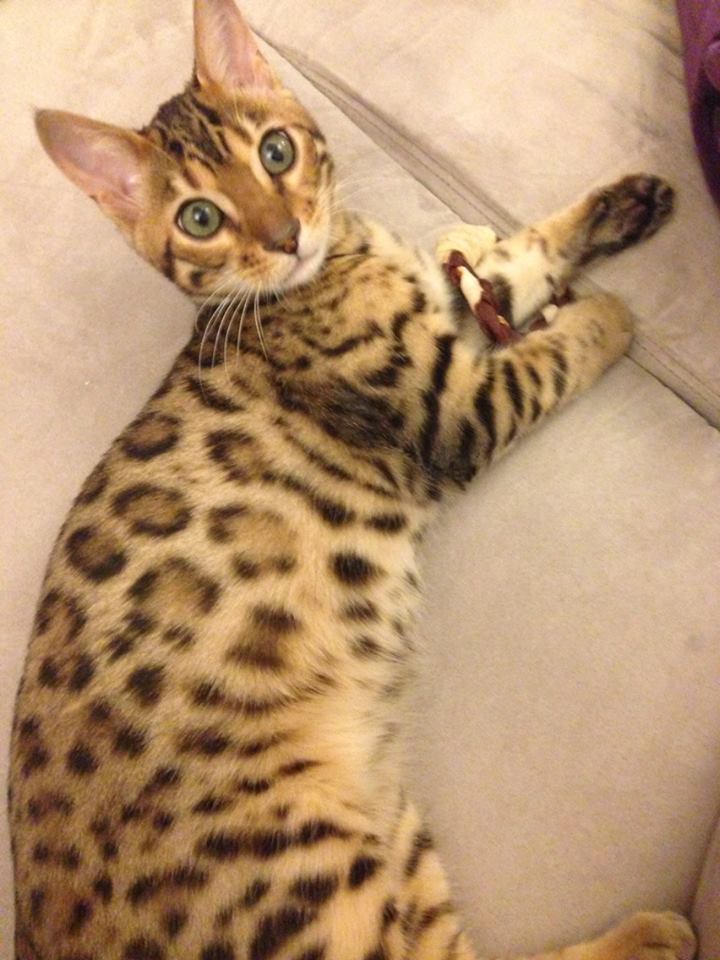 I absolutely adore my Bengal cat from Epsilon Bengals! Malcolm is truly everything I could want in a cat. Obviously he is incredibly soft and stunning, and is complimented by everyone who sees him, but he has a superb personality as well! Malcolm is very friendly and affectionate and came very handleable even as a kitten. And he’s very bright, inquisitive and doesn’t shy away from water, (he will even pop in to hang out with me in the shower sometimes). And he endlessly delights me with his playfulness, he can make any little scrap of something into a toy and can entertain himself for hours. He even plays fetch on occasion! Thank you David, for my gorgeous, sweet, bright, bundle of joy. He’s such a great addition to my life! Thank You, Jordan K and Malcolm