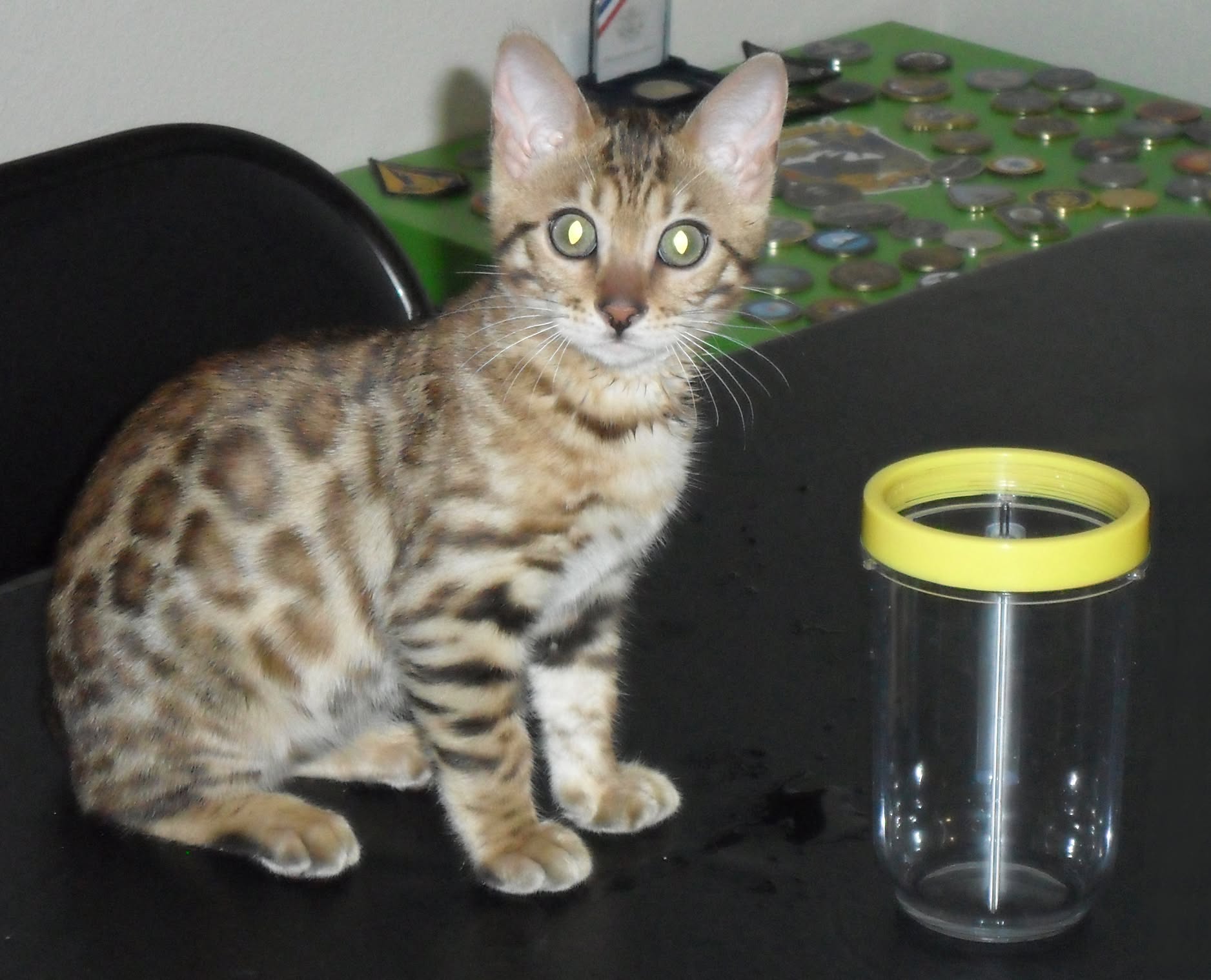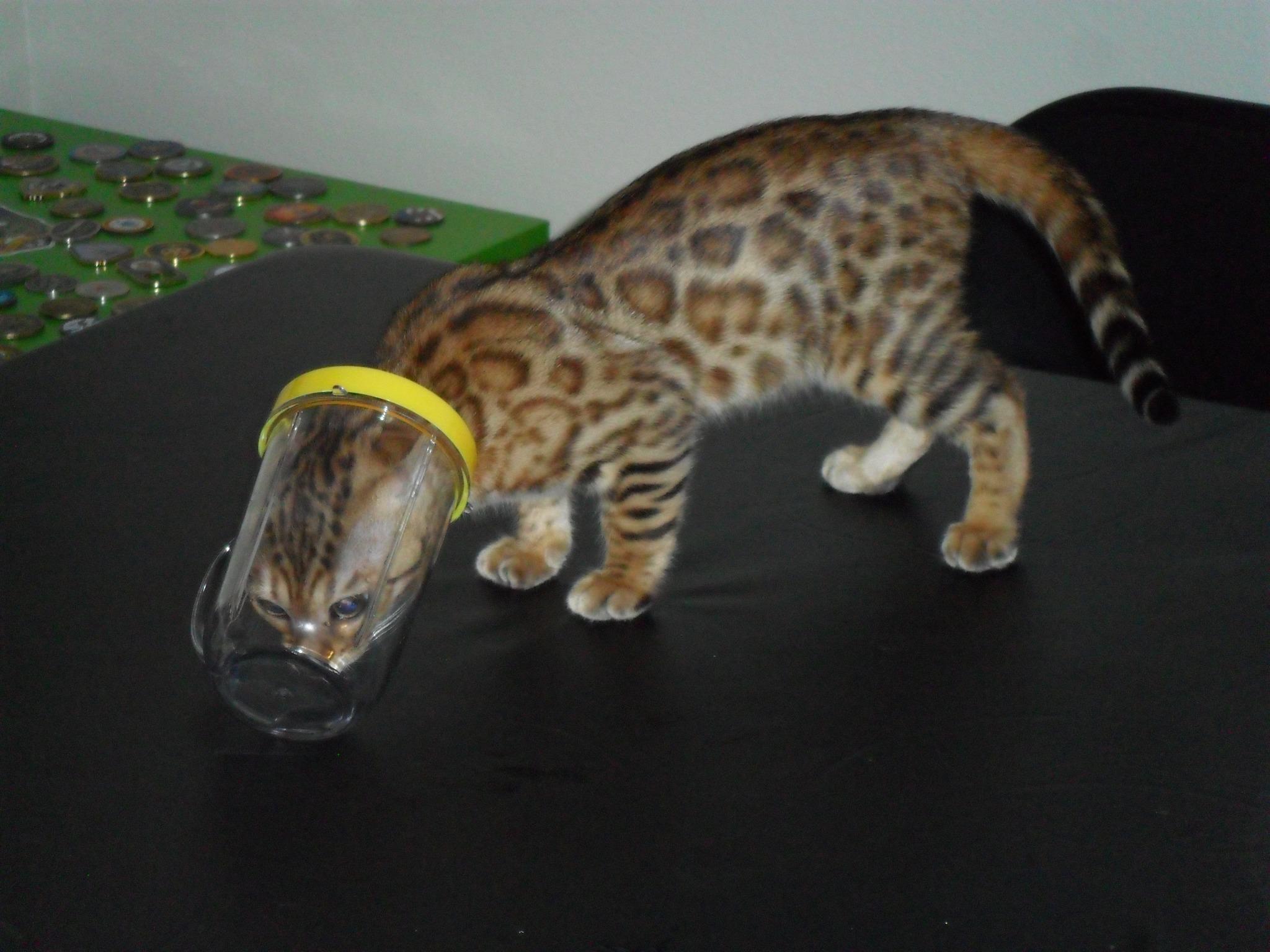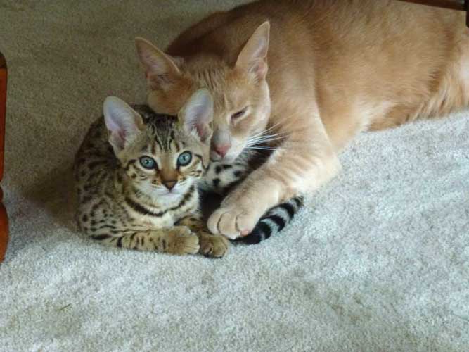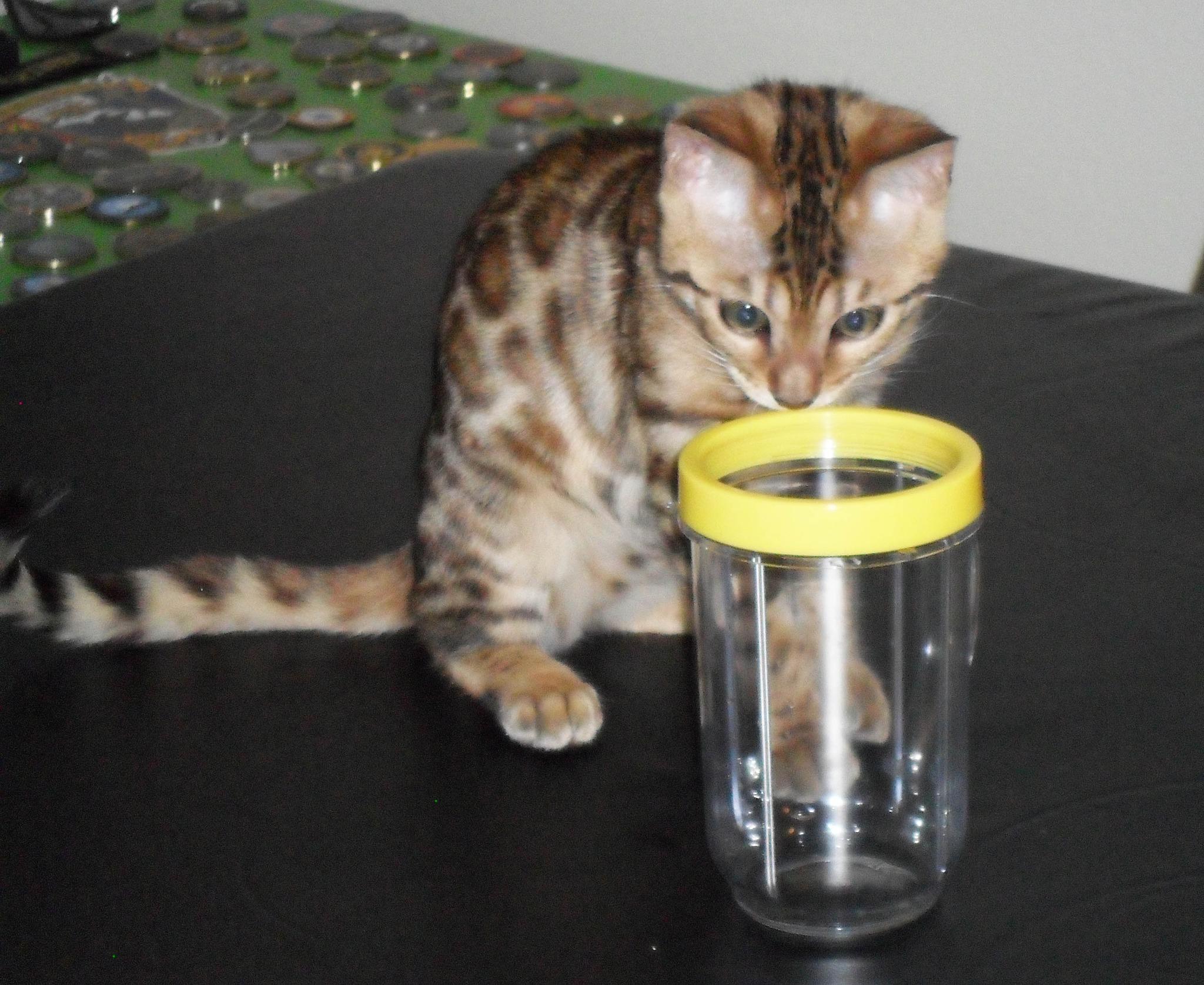 Hi David, I thought I would share a few new photos and a quick update on my Ricki.   She is such a joy to us, so full of life and mischief. She loves the water in the shower and walks right in every day to play since there is not a door, it seems to be the best shower ever for a Bengal. She had a checkup and her last booster shots today with our vet and passed with flying colors, they loved her and everything looked great, she is 3.56 lbs and growing. She is getting along with our other cats very well, especially with our 2 year old male, Clyde (you will see them together in one of the photos). Clyde has taken to her since day one and I think he believes he is her mother 🙂