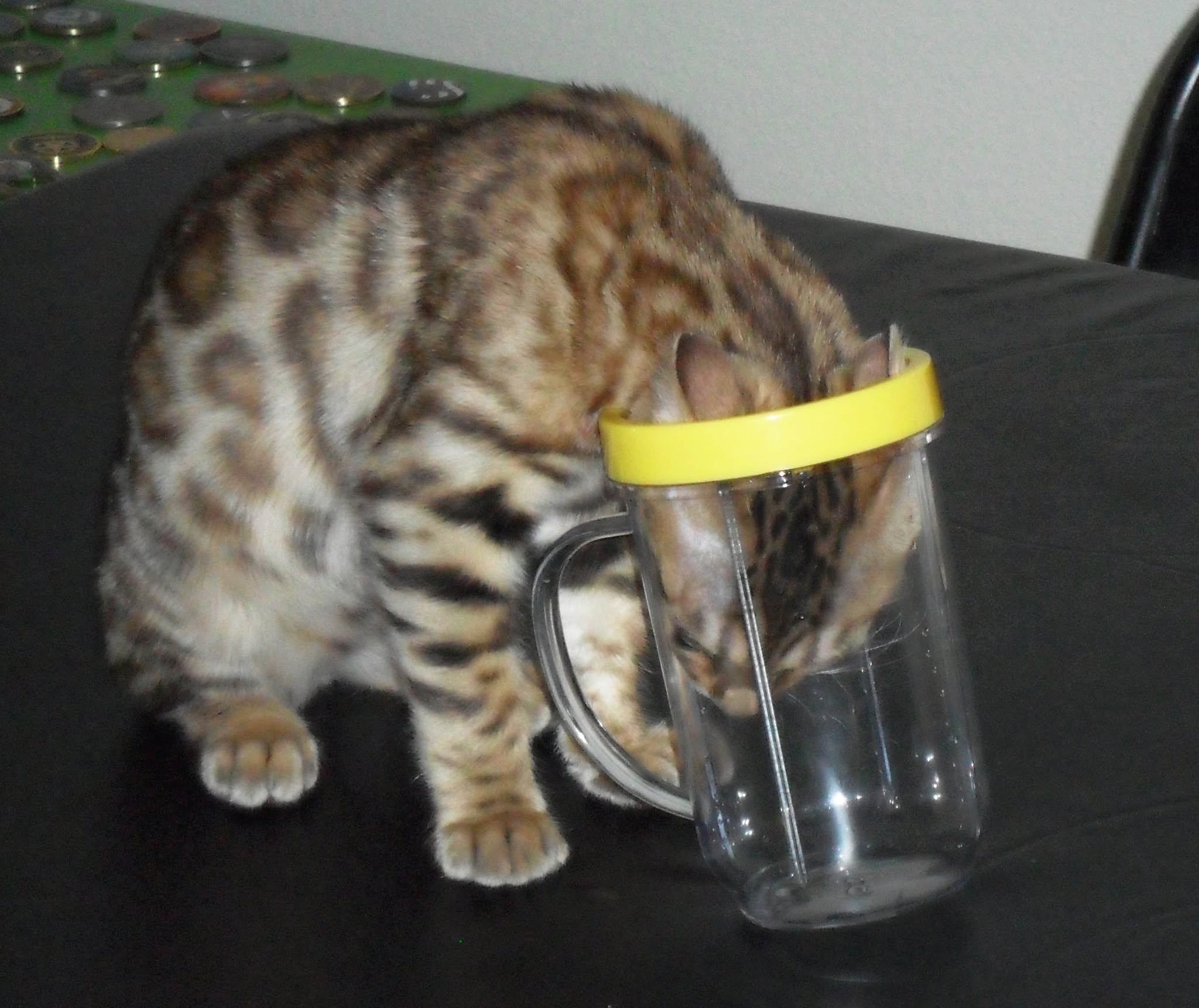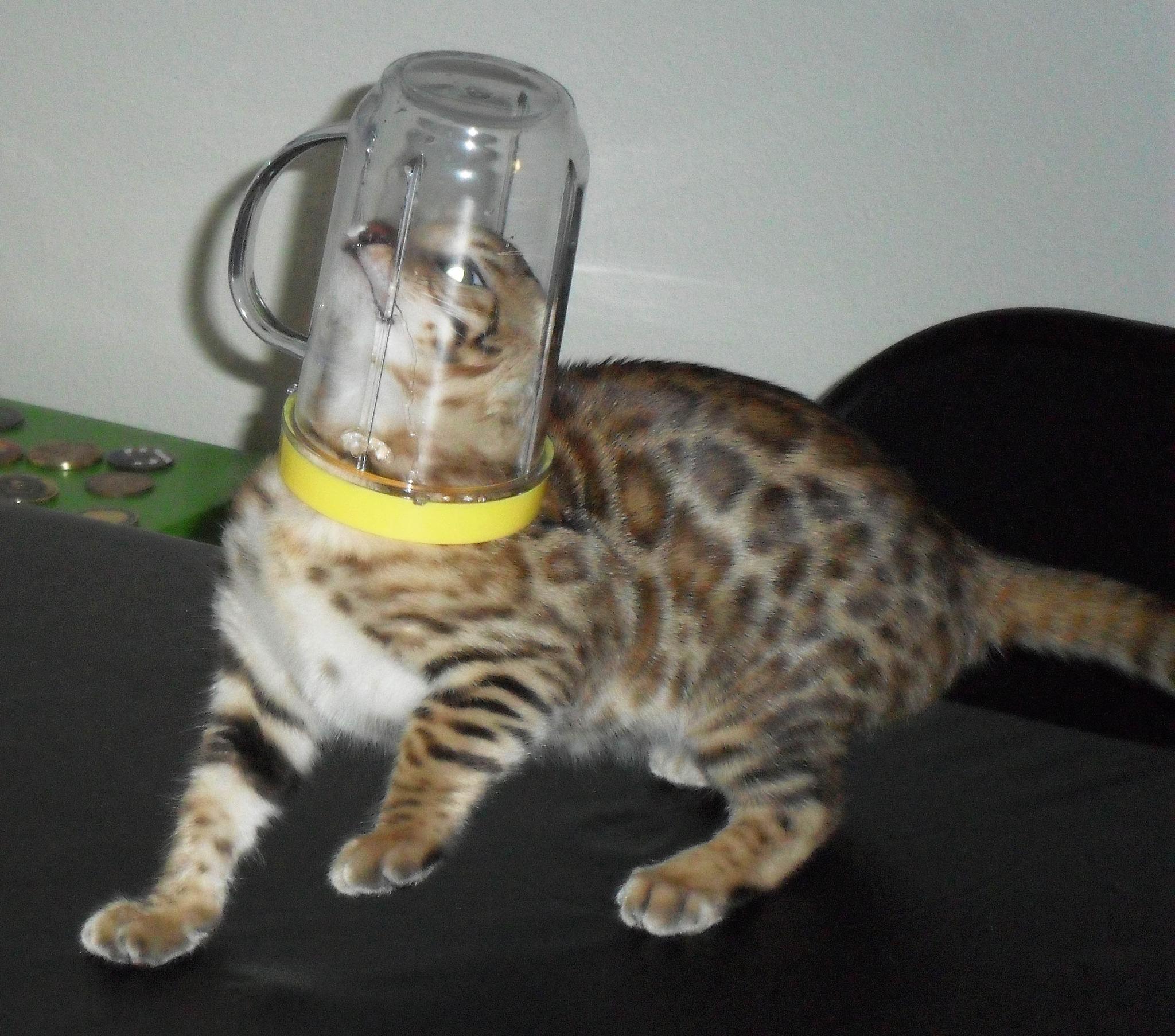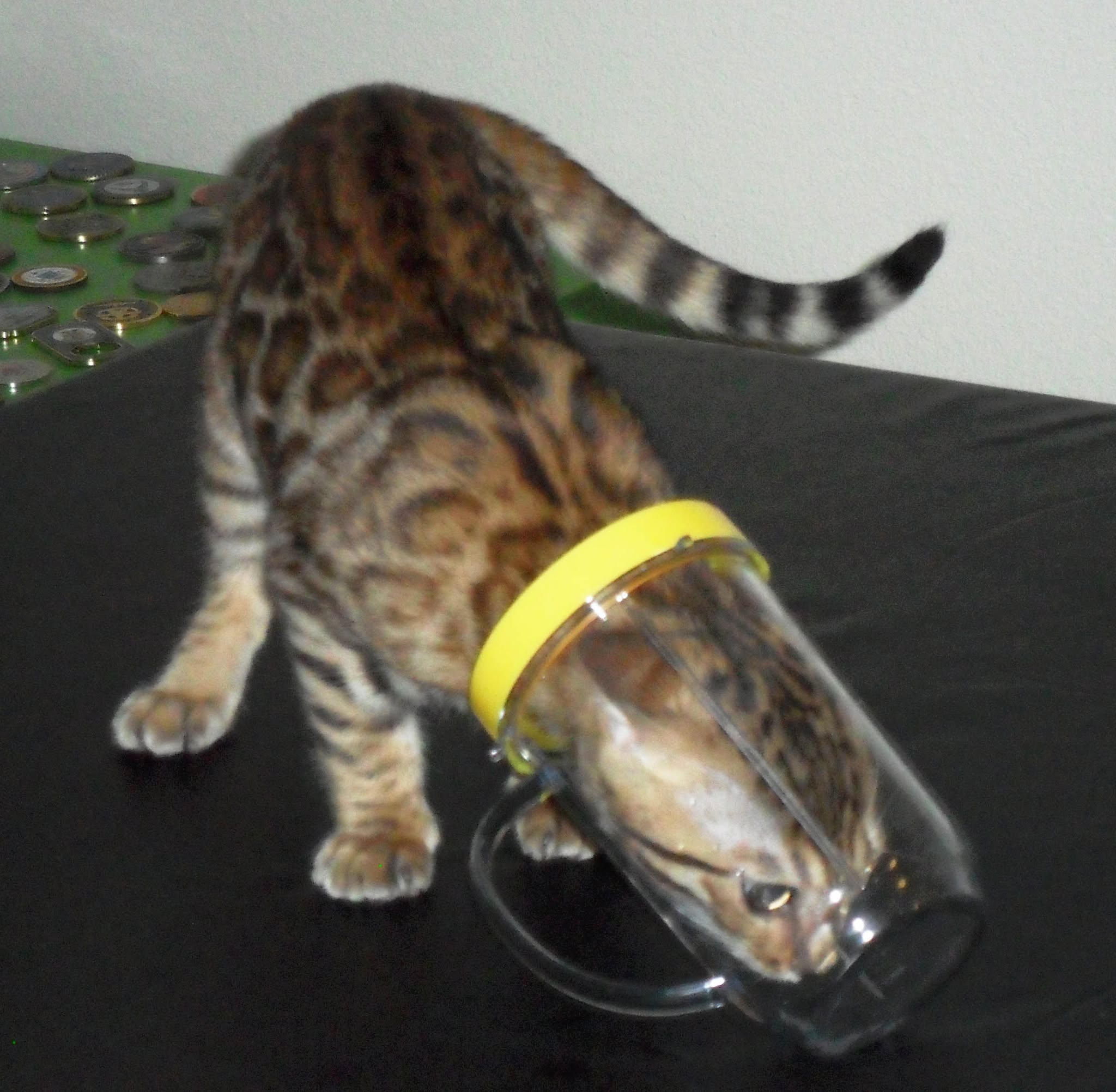 Hi David, I thought I would share a few new photos and a quick update on my Ricki.   She is such a joy to us, so full of life and mischief. She loves the water in the shower and walks right in every day to play since there is not a door, it seems to be the best shower ever for a Bengal. She had a checkup and her last booster shots today with our vet and passed with flying colors, they loved her and everything looked great, she is 3.56 lbs and growing. She is getting along with our other cats very well, especially with our 2 year old male, Clyde (you will see them together in one of the photos). Clyde has taken to her since day one and I think he believes he is her mother 🙂